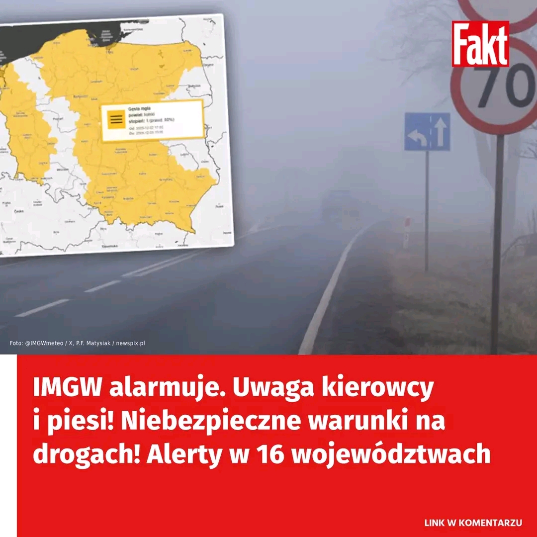 IMGW wydało ostrzeżenia pierwszego stopnia przed gęstą mgłą dla większości województw, w tym warmińsko-mazurskiego, pomorskiego, kujawsko-pomorskiego, łódzkiego, świętokrzyskiego, podkarpackiego, małopolskiego, śląskiego, lubuskiego oraz części województw opolskiego, wielkopolskiego, zachodniopomorskiego, dolnośląskiego, podlaskiego, mazowieckiego i lubelskiego. Widzialność w tych rejonach może spaść poniżej 200 m, a mgły mogą osadzać szadź, powodując śliskość dróg i chodników. Alerty obowiązują od wtorku od godz. 17:00 do środy do godz. 10:00.
