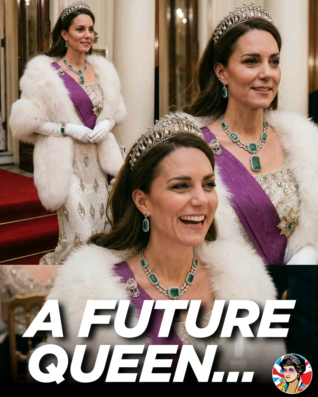 👑 The look is completed with a stunning emerald necklace and matching emerald earrings, adding depth and elegance to a style that reflects the rich history of the British Royal Family. The ceremonial sash and classic royal elements reinforce a presence shaped by tradition and continuity.