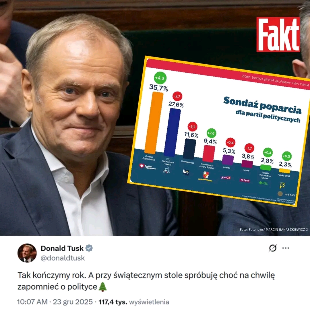 Wyniki sondażu szybko skomentował na platformie X Donald Tusk. “Tak kończymy rok. A przy świątecznym stole spróbuję choć na chwilę zapomnieć o polityce” — napisał premier.
