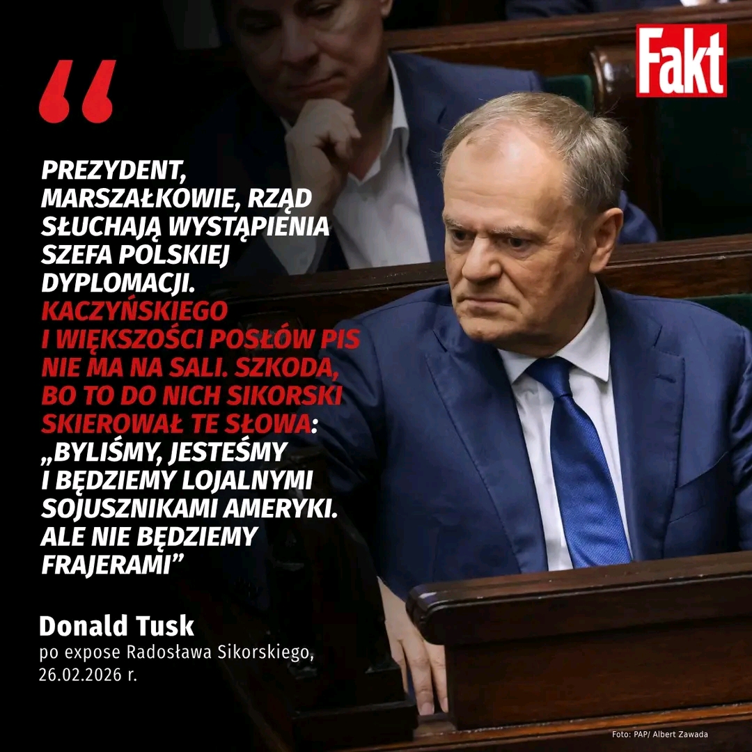 “Prezydent, marszałkowie, rząd słuchają wystąpienia szefa polskiej dyplomacji. Kaczyńskiego i większości posłów PiS nie ma na sali. Szkoda, bo to do nich Sikorski skierował te słowa: »Byliśmy, jesteśmy i będziemy lojalnymi sojusznikami Ameryki. Ale nie będziemy frajerami«” — napisał Donald Tusk, komentując expose Radosława Sikorskiego.