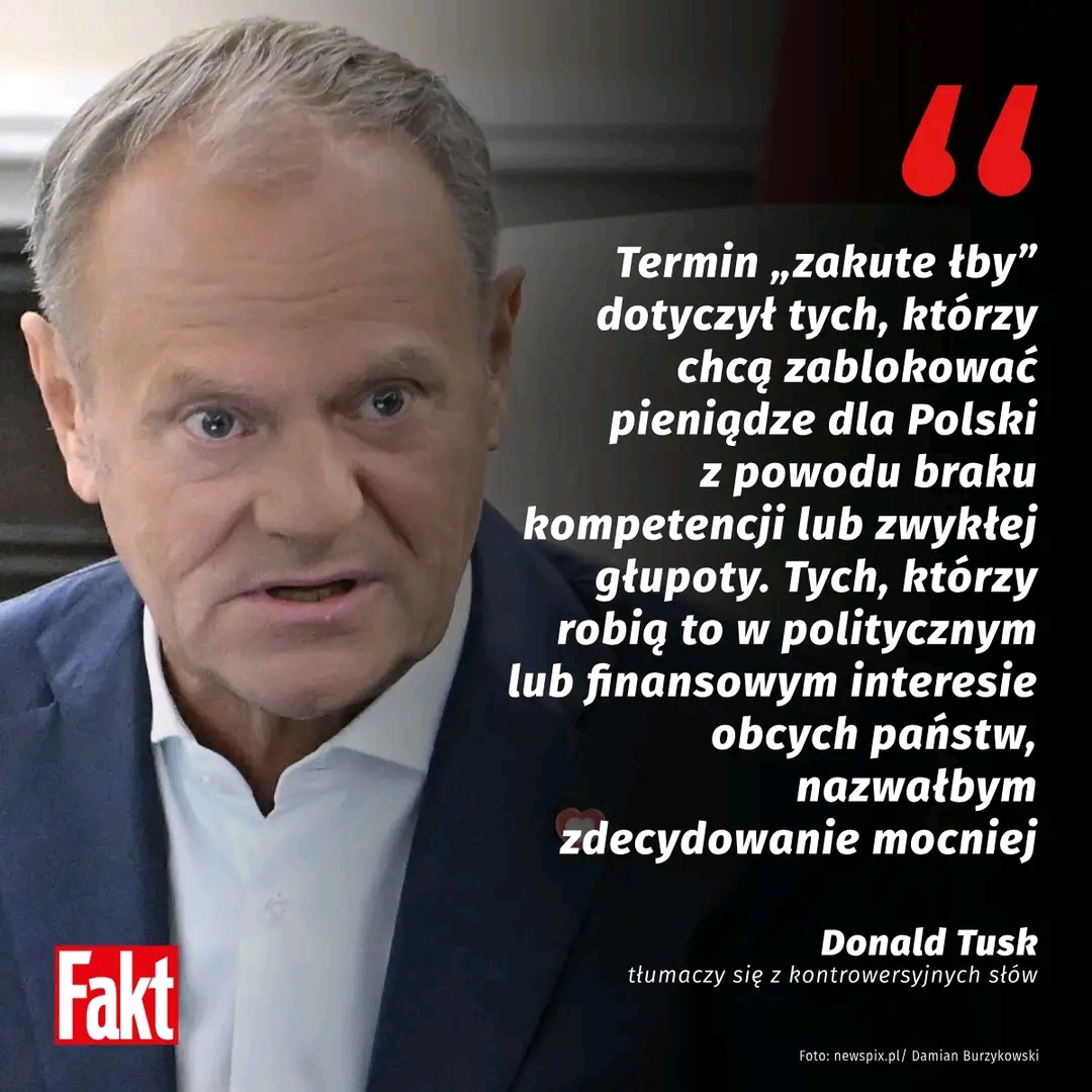 Teraz Donald Tusk tłumaczy się ze swoich słów. “Termin »zakute łby« dotyczył tych, którzy chcą zablokować pieniądze dla Polski z powodu braku kompetencji lub zwykłej głupoty. Tych, którzy robią to w politycznym lub finansowym interesie obcych państw, nazwałbym zdecydowanie mocniej” — podkreślił.