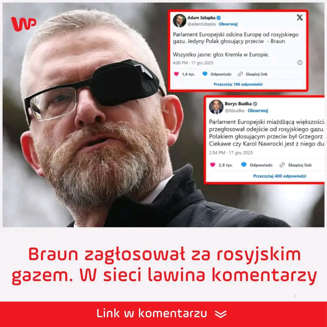 Parlament Europejski miażdżącą większością przegłosował odejście od rosyjskiego gazu. Jedynym Polakiem głosującym przeciw był Grzegorz Braun. Ciekawe czy Karol Nawrocki jest z niego dumny?” – zapytał Borys Budka, polityk KO.