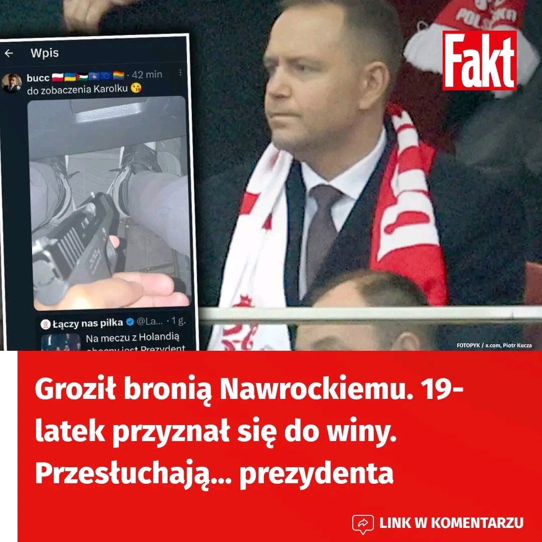 W sobotę (15.11) policja zatrzymała 19-latka podejrzanego o grożenie bronią Nawrockiemu — mężczyzna zamieścił w mediach społecznościowych zdjęcie broni palnej z podpisem “do zobaczenia Karolku” — w odpowiedzi na informację PZPN o meczu reprezentacji Polski w piłkę nożną z Holandią. Choć post szybko zniknął, jego zapis krążył po sieci. W niedzielę doszło do przesłuchania w warszawskiej prokuraturze dzielnicy Śródmieście. Rzecznik, prokurator Piotr Skiba przekazał, że podejrzany mężczyzna “wyraził skruchę”.