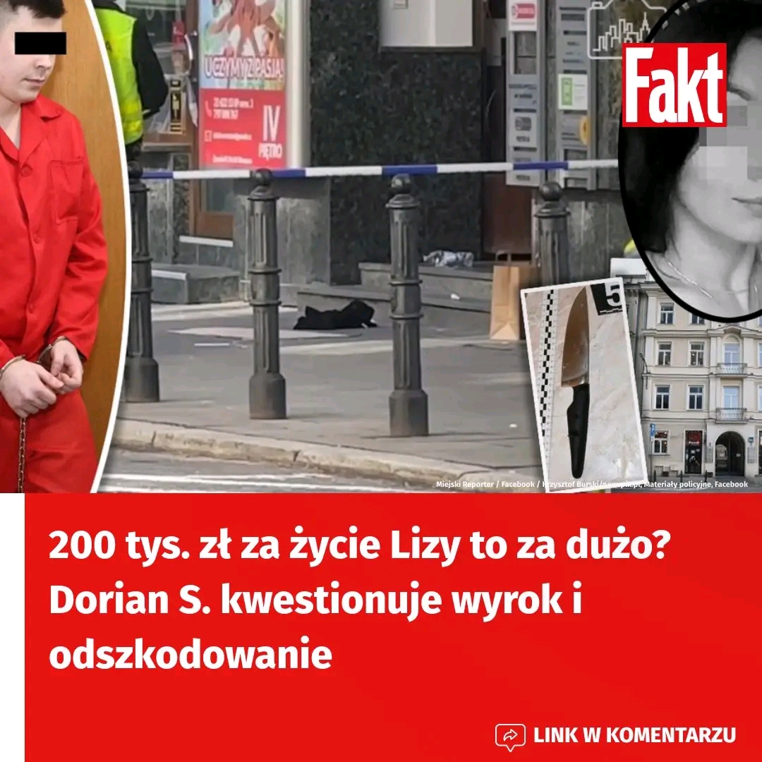 Czy 200 tys. zł to za dużo za śmierć Lizy zaatakowanej w centrum Warszawy? Jak dowiedział się “Fakt”, skazany na dożywocie za zgwałcenie i śmierć 25-latki Dorian S. kwestionuje tę sumę. Adwokatka rodziny Lizy mówi nam wprost: — Żadna kwota nie przywróci jej życia. I zadaje pytanie? — Czy można wycenić ludzką krzywdę? Były partner zamordowanej Białorusinki nie chce jednak tych pieniędzy dla siebie.