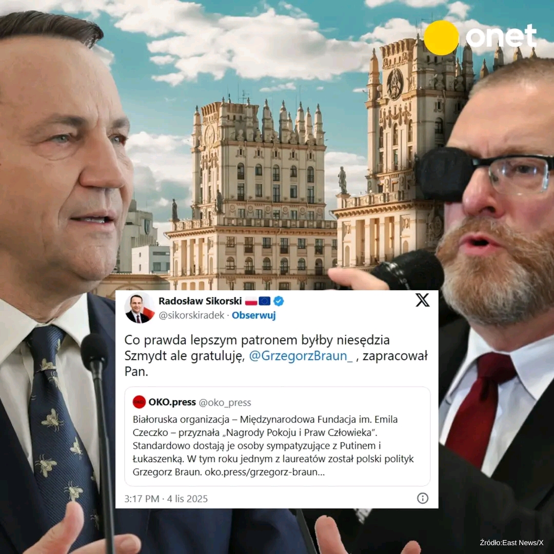 Szef MSZ Radosław Sikorski krytycznie odniósł się do przyznania Grzegorzowi Braunowi “Nagrody Pokoju i Praw Człowieka” przez białoruską propagandową Międzynarodową Fundację im. Emila Czeczki.