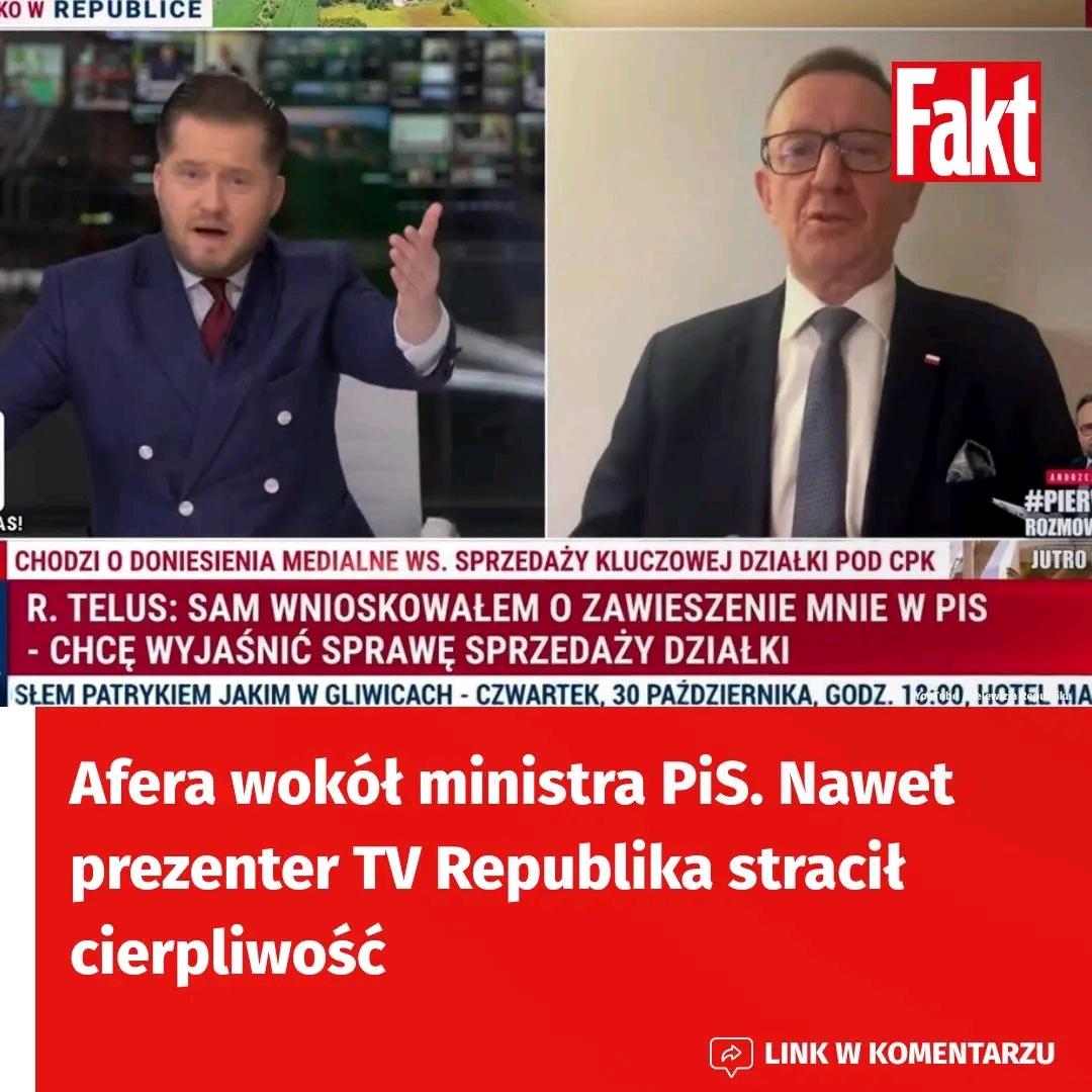 Robert Telus został zawieszony w prawach członka PiS. Po wydaniu oświadczenia polityk udał się do Telewizji Republika. Na antenie przekonywał, że nie wiedział o sprzedaży działki, przez którą ma przebiegać linia kolejowa CPK. Nagle wspomniał o pochodzeniu firmy. — Nie sprowadzajmy do absurdu teraz tej sprawy — zareagował prezenter.