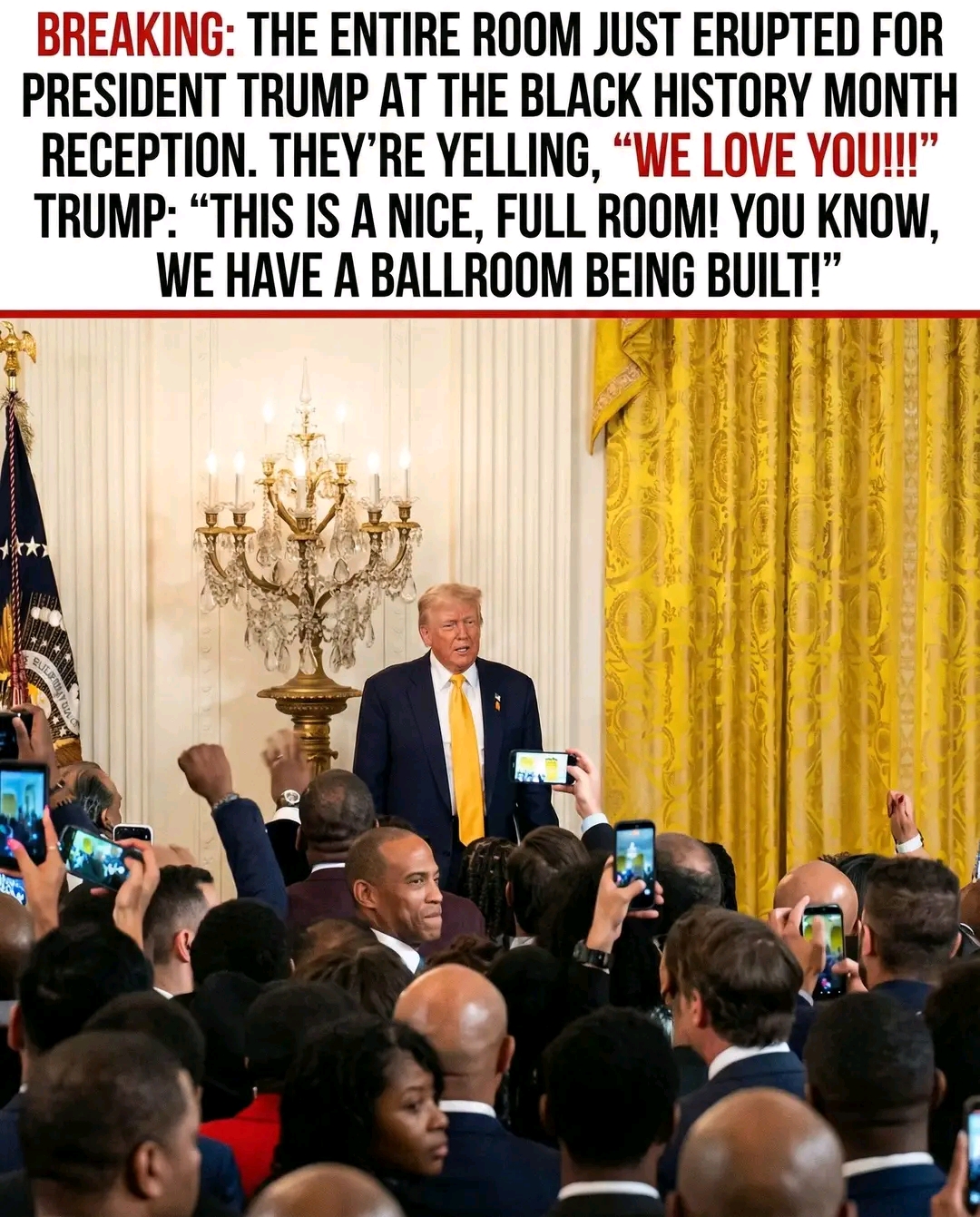BREAKING: The entire room just ERUPTED for President Trump at the Black History Month reception They’re yelling, “WE LOVE YOU!!!” TRUMP: “This is a nice, FULL room! You know, we have a ballroom being built!”