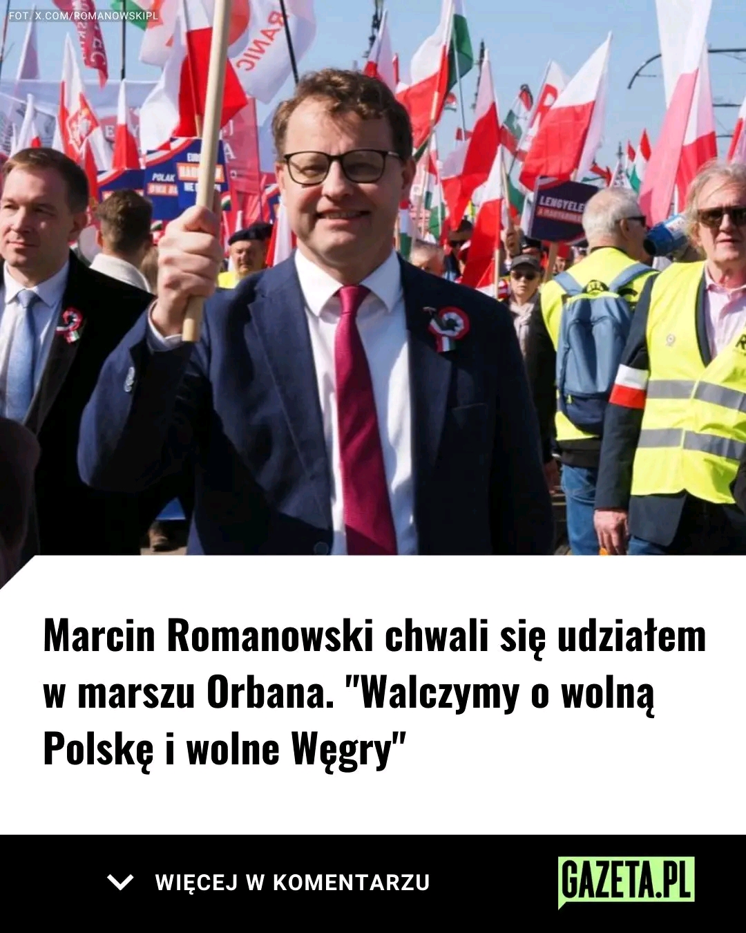 Biało-czerwone i czerwono-biało-zielone flagi obok siebie – tak jak przez wieki w naszych wspólnych zmaganiach o wolność. Dziś ta walka trwa nadal. Walczymy o wolną Polskę i wolne Węgry – o Europę suwerennych narodów, która potrafi obronić swoje granice i bezpieczeństwo, swoją kulturę i cywilizację!” – napisał Romanowski na platformie X.