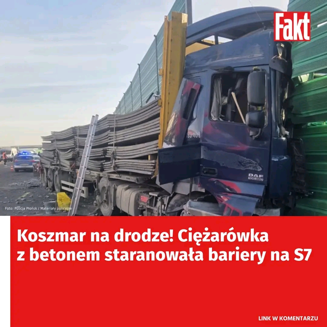 Sytuacja na drodze krajowej nr 7 w rejonie Cempkowa, niedaleko Płońska (woj. mazowieckie) przyprawiła kierowców o solidny zastrzyk adrenaliny. Samochód ciężarowy marki DAF przewożący betonowe płyty uderzył w barierę rozdzielającą pasy ruchu. Jak wynika z pierwszych ustaleń, w pojeździe jadącym w stronę Gdańska najprawdopodobniej wystrzeliła opona. Doszło do bardzo poważnych utrudnień na trasie.