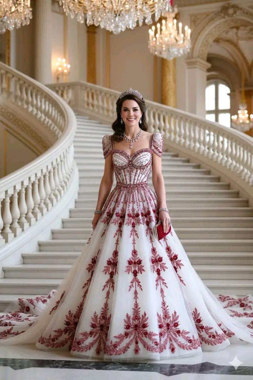 Draped in a masterpiece of crimson and ivory, this look is more than just a gown—it is a statement. The intricate red embroidery cascading down the pristine white fabric symbolizes both strength and purity, a fitting tribute to the poise required of a modern princess. From the shimmering tiara to the perfectly coordinated clutch, every detail has been curated to perfection. 🌹👑