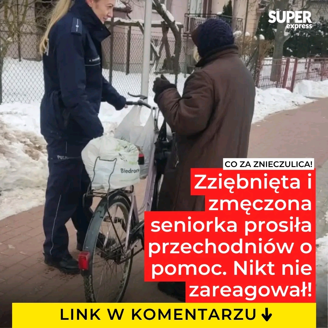 Samotna seniorka prosiła przechodniów o pomoc. Była zziębnięta i zmęczona. Po śliskim chodniku prowadziła rower obładowany zakupowymi torbami. To były jej żywieniowe zapasy na dwa tygodnie. Nikt nie zareagował na prośbę starszej kobiety. Nikt się nie zatrzymał. Na szczęście pomocną dłoń do seniorki wyciągnęli dzielnicowi oraz strażak.