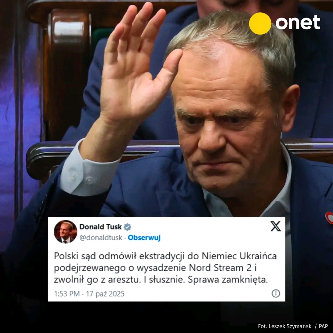Sprawa zamknięta” — napisał Donald Tusk w serwisie X po ogłoszeniu przez sąd decyzji o w sprawie podejrzanego o wysadzenie Nord Stream Wołodymyra Ż. Polski premier stwierdził, że podjęta decyzja jest słuszna.
