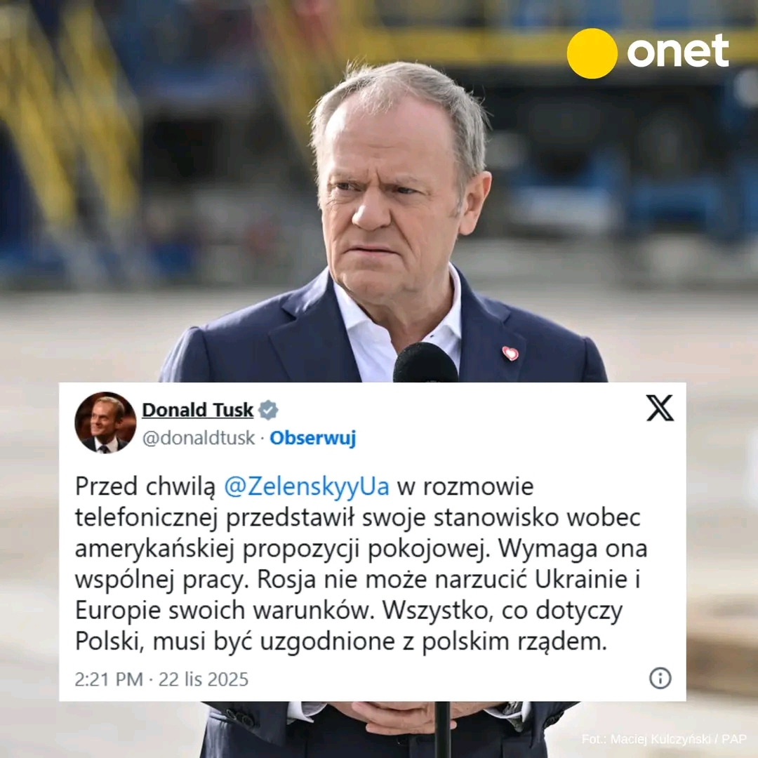 “Przed chwilą Wołodymyr Zełenski w rozmowie telefonicznej przedstawił swoje stanowisko wobec amerykańskiej propozycji pokojowej. Wymaga ona wspólnej pracy. Rosja nie może narzucić Ukrainie i Europie swoich warunków. Wszystko, co dotyczy Polski, musi być uzgodnione z polskim rządem” — napisał w sobotę po południu na portalu X Donald Tusk