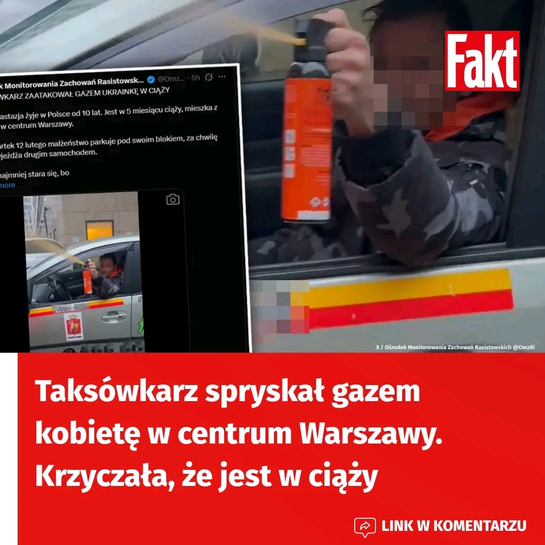 W sieci pojawiło się 26-sekundowe nagranie z centrum Warszawy. Widać na nim kierowcę taksówki rozpylającego gaz w stronę osób stojących przed autem. Poszkodowana ma być para z Ukrainy. W tle słychać kobietę, która krzyczy, że jest w ciąży. Sprawą zajmuje się policja. — Traktujemy ją bardzo poważnie — mówi “Faktowi” mł. asp. Jakub Pacyniak z Komendy Rejonowej Policji Warszawa I. Skontaktowaliśmy się także z firmą, której numer widnieje na drzwiach pojazdu. — Ten człowiek się pod nas podszywa — twierdzi szef korporacji.