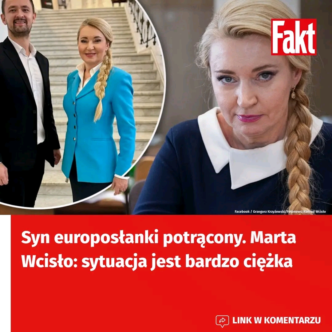 Lubelski radny i syn europosłanki KO Konrad Wcisło został potrącony na pasach w Lublinie. W rozmowie z “Faktem” Marta Wcisło przekazała, że jej syn “ma różne obrażenia” i “jest w gipsie od pasa do szyi”. — Sytuacja jest bardzo ciężka: po pierwsze jest unieruchomiony, po drugie synowa na początku stycznia rodzi, po trzecie ma maleńkie, dwuletnie dziecko — przyznała.