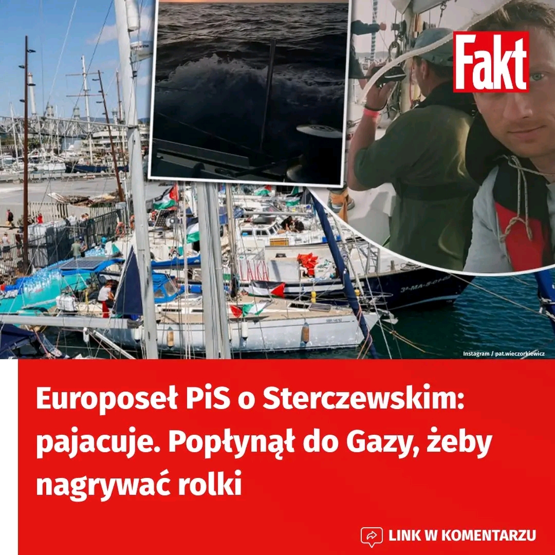 Tobiasz Bocheński mówił na antenie Radia Zet, że sytuacja w Strefie Gazy wymaga reakcji, ale nie reakcji Franciszka Sterczewskiego, który “żegluje po morzu Śródziemnym, żeby zwrócić na siebie uwagę”. — Jest to pajacowanie w jego wykonaniu, a nie żadne zwracanie uwagi świata na ludobójstwo — stwierdził europoseł PiS. Dodał, że “nie ma empatii” dla jego losów, bo poseł KO popłynął tam “nagrywać rolki na Instagrama i pokazywać, jaki jest bohaterski”.