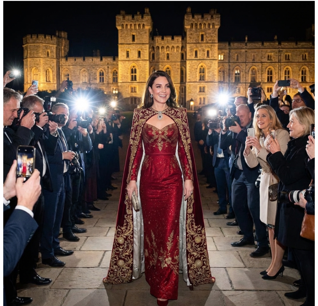 Fans are astounded. At Windsor, Princess Catherine ignites her crimson queen era while wearing an iconic gown and queen’s jewels. Her latest appearance at Windsor Castle has heralded a new chapter in royal fashion, captivating audiences worldwide and redefining the perception of modern royalty. This extraordinary display of style, grace, and political symbolism has been a transformative event, sparking debates among fashion enthusiasts, royal watchers, and cultural commentators alike. Princess Catherine’s choice of ensemble was more than just a sartorial decision; it was a statement of strength, unity, and regal authority. Her stunning crimson gown, elevated by exquisite queen’s jewels and dramatic cape details, embodied a powerful narrative of resilience and diplomatic elegance that will be remembered in royal history for years to come.