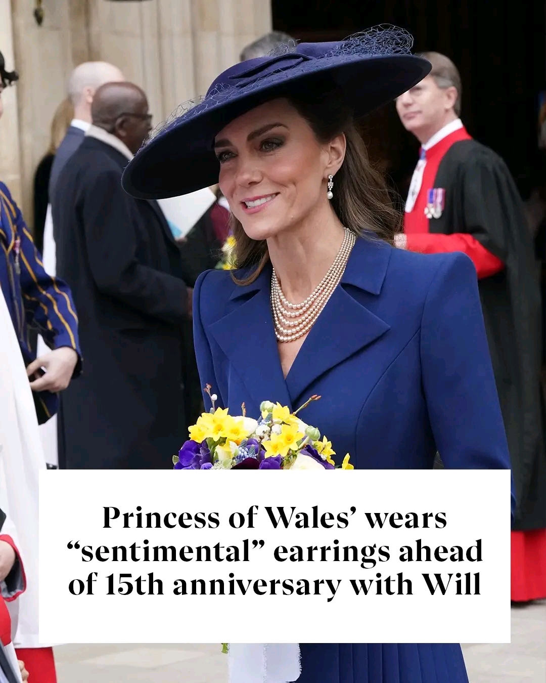 Kate wore the late Queen’s Bahrain pearl earrings, which provide a subtle nod to her personal love story. Royal Commentator Victoria Howard explains that, ‘the earrings are a firm favourite, coming from pearls Elizabeth was gifted for her wedding.’ The Princess paired the earrings with an all-navy ensemble, wearing a Catherine Walker midi-length coat-dress and a wide hat set at an angle. ‘The earrings are a perfect classical addition to a church outfit for such a service, as the length helps balance out her wide-brimmed hat,’ adds Victoria.