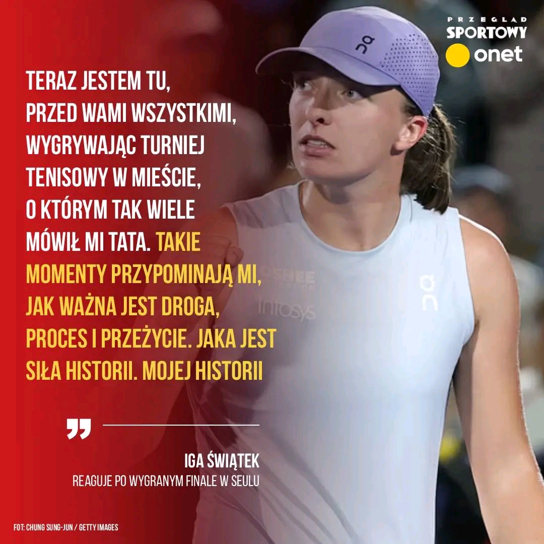Na kilka godzin po niesamowitym finale w Seulu Iga Świątek zwróciła się do kibiców na Instagramie. W długim wpisie podsumowującym zwycięstwo w turnieju przekazała kibicom, że jej tata wiele opowiadał jej o koreańskim mieście. To właśnie tam sam miał okazję wystąpić podczas igrzysk olimpijskich w 1988 r. “Takie momenty przypominają mi, jak ważna jest droga, proces i przeżycie. Jaka jest siła historii. Mojej historii” — pisze Iga Świątek.
