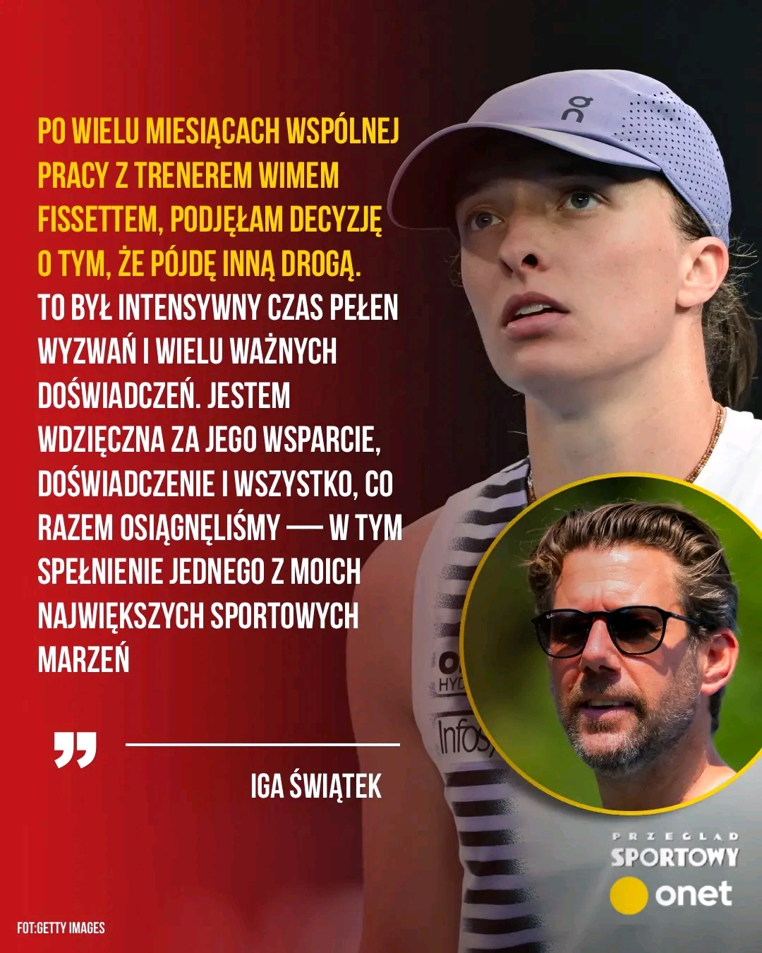 “Jednocześnie, po wielu miesiącach wspólnej pracy z trenerem Wimem Fissettem, podjęłam decyzję o tym, że pójdę inną drogą. To był intensywny czas pełen wyzwań i wielu ważnych doświadczeń. Jestem wdzięczna za jego wsparcie, doświadczenie i wszystko, co razem osiągnęliśmy — w tym spełnienie jednego z moich największych sportowych marzeń” — dodaje, wspominając sukces podczas Wimbledonu 2025. Świątek sięgnęła po najbardziej prestiżowy turniej właśnie pod wodzą Belga, uchodzącego za specjalistę od kortów trawiastych.