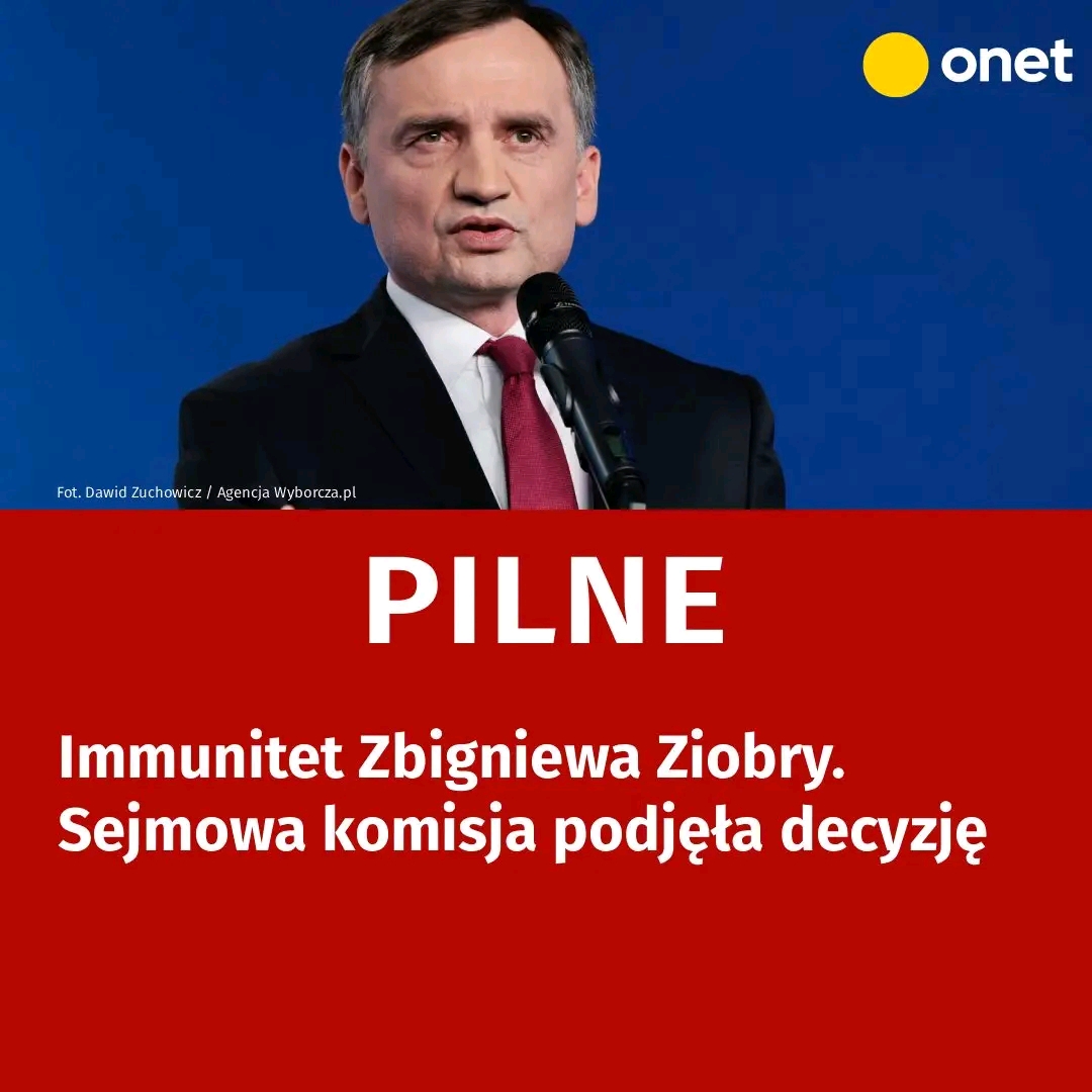 Sejmowa komisja regulaminowa zarekomendowała uchylenie immunitetu Zbigniewowi Ziobrze. — W zakresie wszystkich 26 czynów, które są we wniosku oraz zakresie pozwolenia na zatrzymanie wynik jest pozytywny. Taka jest rekomendacja komisji — przekazał przewodniczący Jarosław Urbaniak z Koalicji Obywatelskiej.