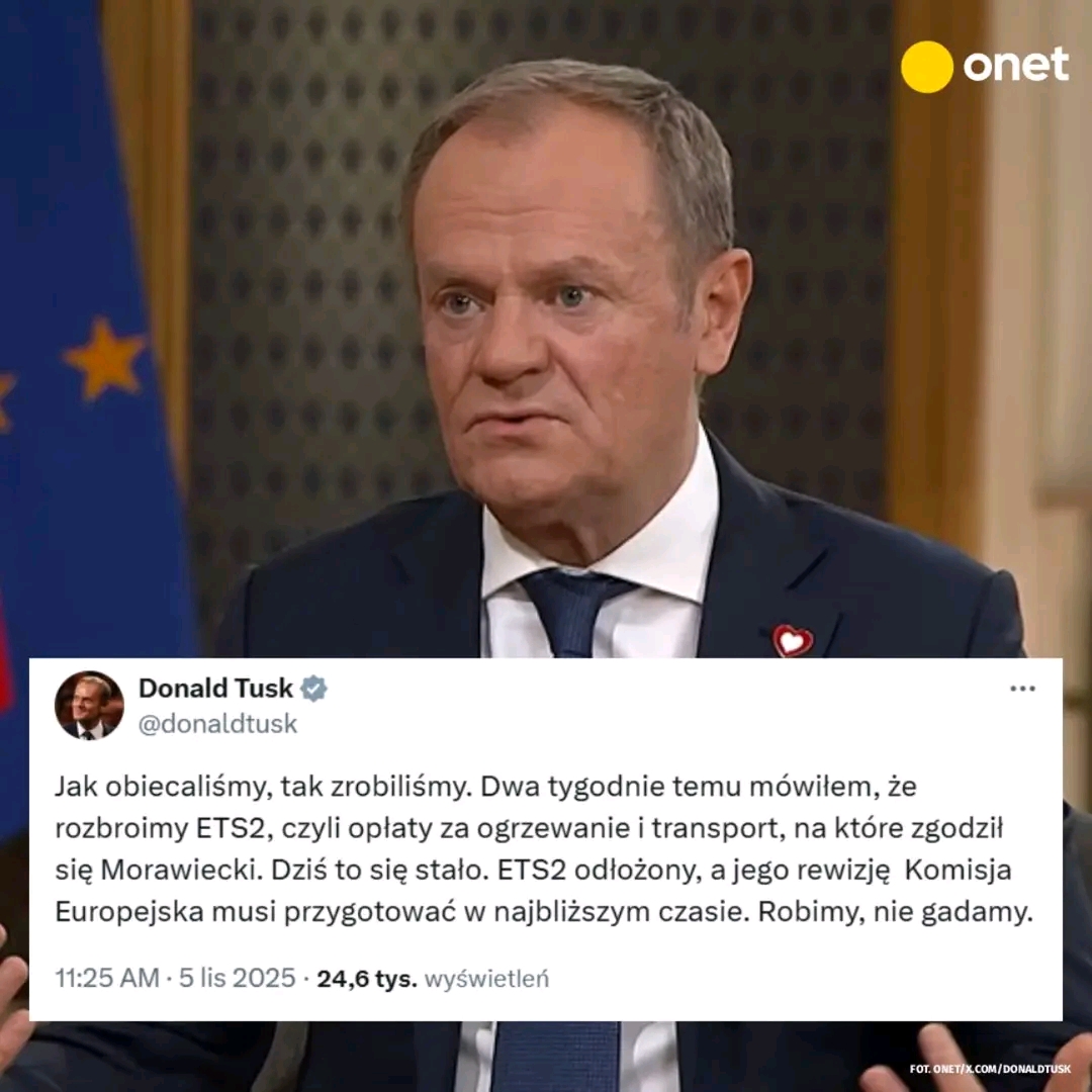 Jak obiecaliśmy, tak zrobiliśmy. Dwa tygodnie temu mówiłem, że rozbroimy ETS2, czyli opłaty za ogrzewanie i transport, na które zgodził się Morawiecki. Dziś to się stało. ETS2 odłożony, a jego rewizję Komisja Europejska musi przygotować w najbliższym czasie. Robimy, nie gadamy” — stwierdził premier.