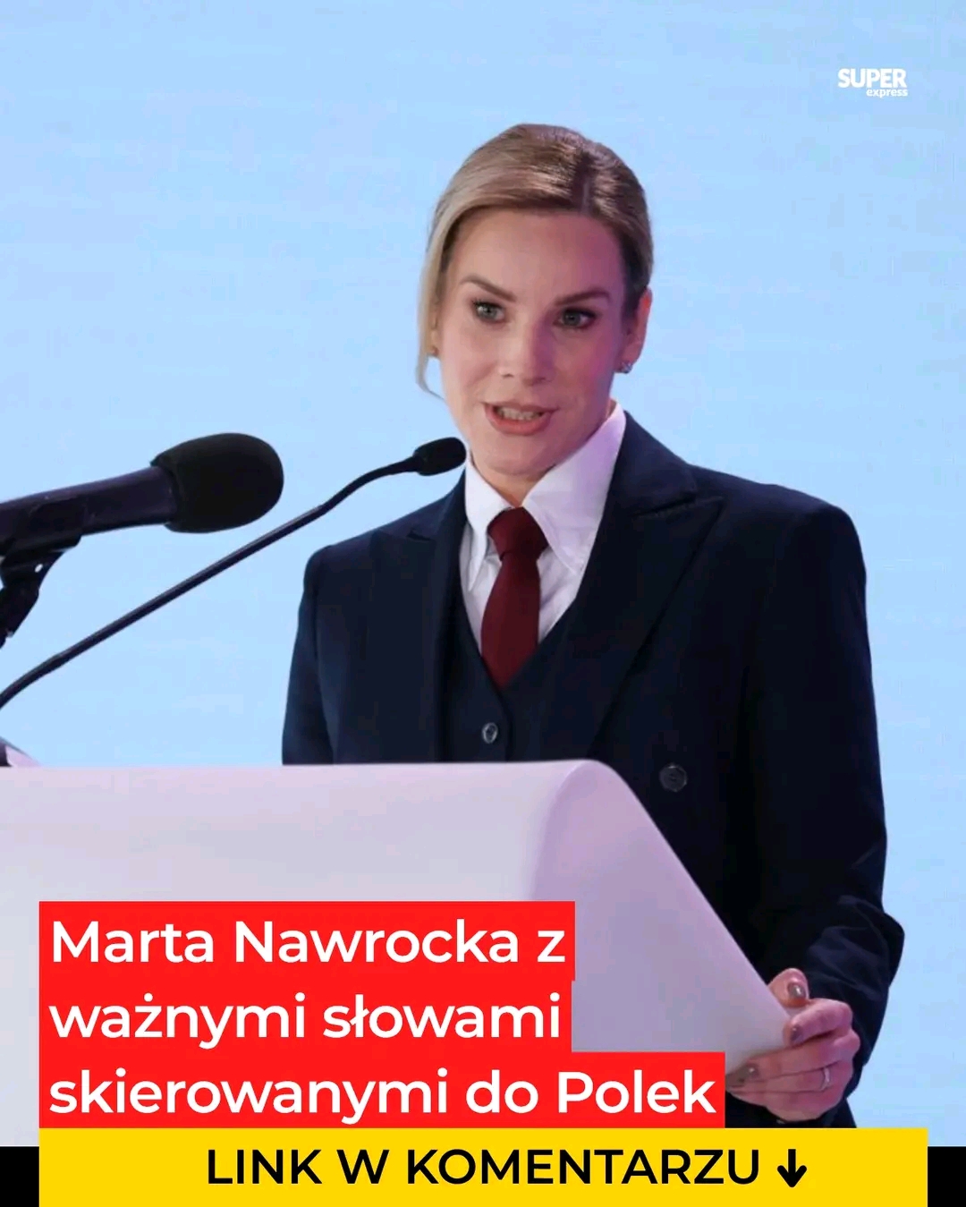 Na konferencji Marta Nawrocka zaprezentowała się w stroju, który z pewnością nie był przypadkowy. Postawiła na stylizację nawiązującej do męskich strojów, czy garniturze z marynarką i… krawatem! Marynarka z ozdobnymi guzikami w kolorze granatowym idealnie współgrała z bordowym krawatem i białą koszulą. Widać, że pierwsza dama chciała postawić mocny akcent swoim strojem. Nawrocka zrezygnowała z mocnej biżuterii, postawiła na delikatne kolczyki, a całość dopełniła prostą fryzurą, czyli kokiem. Swoim wizerunkiem w czasie konferencji przypominała nieco stroje pierwszych feministek. Zobaczcie sami w galerii niżej.