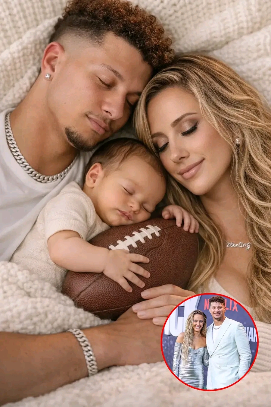 A newborn baby, wrapped in a tiny red-and-gold blanket, resting peacefully in Patrick Mahomes’ arms.