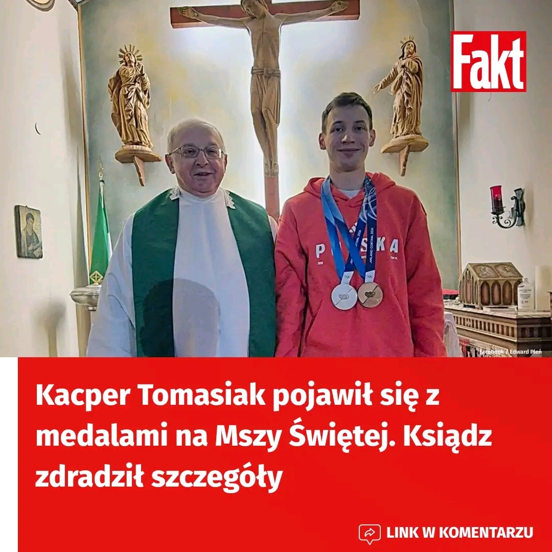 Było siedem godzin do konkursu duetów, gdy Kacper Tomasiak uczestniczył w mszy świętej w wiosce olimpijskiej w Predazzo. Przyniósł na nią dwa medale, o czym “Faktowi” opowiedział ksiądz Edward Pleń. — To była bardzo wzruszająca msza święta. Kacper był lektorem i chciał podziękować Bogu za medale — wyznał kapłan.