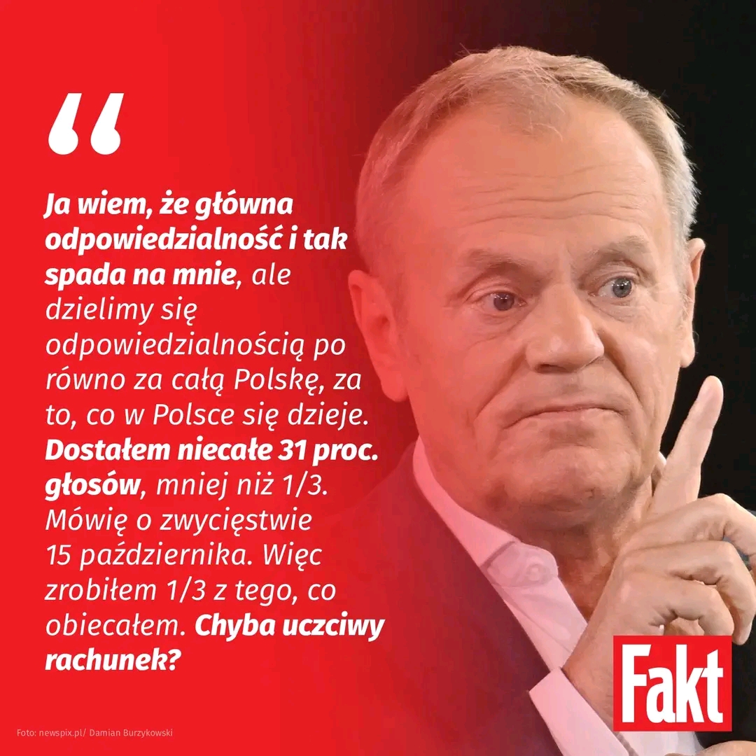 Ja wiem, że główna odpowiedzialność i tak spada na mnie, ale dzielmy się odpowiedzialnością po równo za całą Polskę, za to, co w Polsce się dzieje. Dostałem niecałe 31 proc. głosów, mniej, niż 1/3. Mówię o zwycięstwie 15 października, ale ja dostałem 31 proc. , znaczy moja partia, 31 proc. Więc zrobiłem 1/3 z tego, co obiecałem. Chyba uczciwy rachunek? — kontynuował szef polskiego rządu.