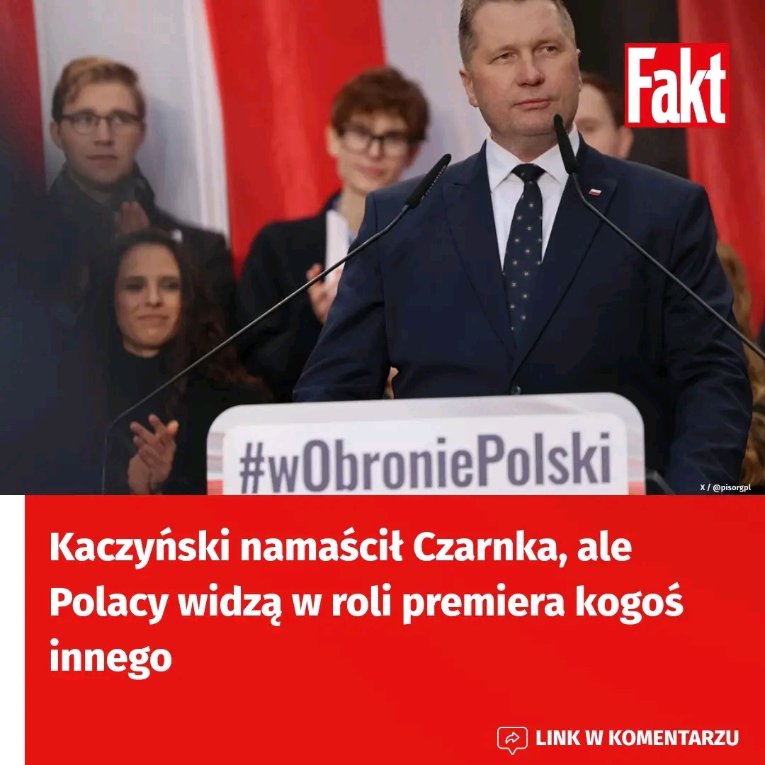 Nie był jak dotąd premierem, ale pewnie będzie, pan minister Przemysław Czarnek — mówił na manifestacji PiS 11 października Jarosław Kaczyński, co wiele osób odebrało jako namaszczenie na przyszłego szefa rządu. Tymczasem w najnowszym sondażu IBRiS dla Onetu respondentów zapytano, kto powinien zostać premierem, gdyby po następnych wyborach parlamentarnych rząd utworzyłyby PiS i Konfederacja. Najwięcej ankietowanych wskazało na Mateusza Morawieckiego. Czarnek znalazł się dopiero na piątym miejscu.