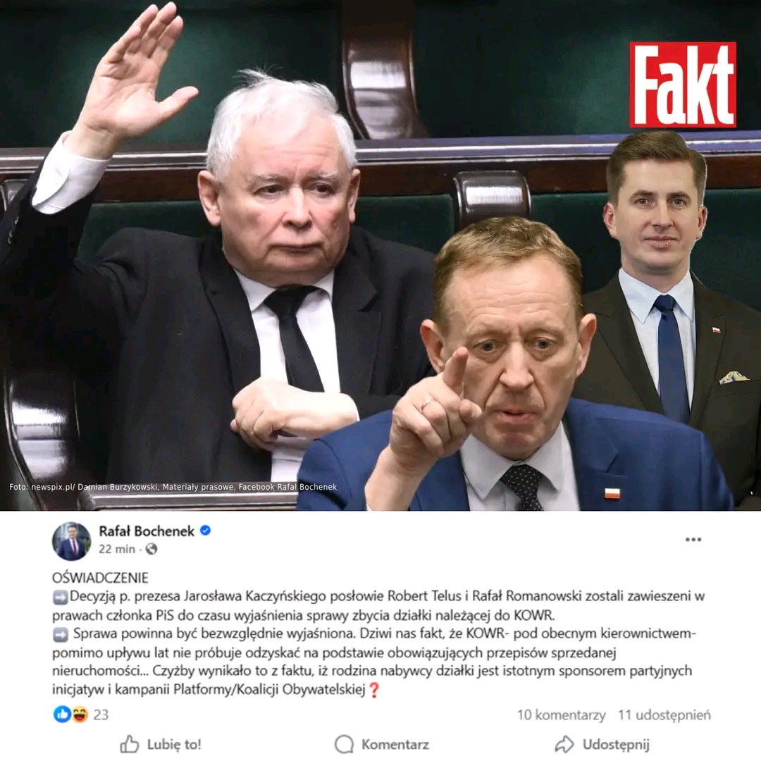 Robert Telus i Rafał Romanowski zostali zawieszeni w prawach członka PiS do czasu wyjaśnienia sprawy zbycia działki należącej do KOWR” — poinformował rzecznik partii Rafał Bochenek. Decyzję podjął prezes ugrupowania Jarosław Kaczyński. Chodzi o aferę wokół sprzedaży gruntu, przez który przebiegać ma linia kolejowa w ramach CPK.