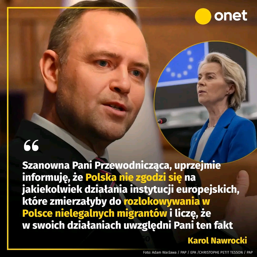 Szanowna Pani Przewodnicząca, przed Komisją Europejską stoją w najbliższym czasie istotne decyzje, uprzejmie informuję więc, że Polska nie zgodzi się na jakiekolwiek działania instytucji europejskich, które zmierzałyby do rozlokowywania w Polsce nielegalnych migrantów i liczę, że w swoich działaniach uwzględni Pani ten fakt” — napisał prezydent Karol Nawrocki w liście skierowanym do szefowej Komisji Europejskiej Ursuli von der Leyen.