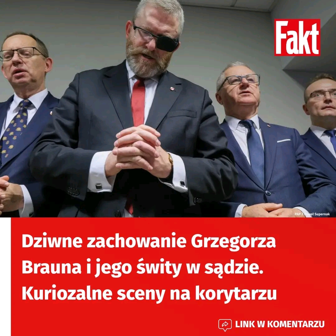 Pierwsza rozprawa Grzegorza Brauna, europosła Konfederacji Korony Polskiej, odbyła się 8 grudnia 2025 r. Rano przed Sądem Rejonowym dla Warszawy Pragi-Południe zebrali się zwolennicy polityka. Najpierw byli przed budynkiem, a potem wszyscy przenieśli się na salę rozpraw. Na miejscu pojawił się m.in. Janusz Korwin Mikke oraz “Jaszczur” i “Ludwiczek”, czyli liderzy skrajnie prawicowego ruchu Rodacy Kamraci (obaj wyszli niedawno z aresztu, gdzie przebywali z powodu siania wulgarnych i ekstremistycznych treści w internecie).