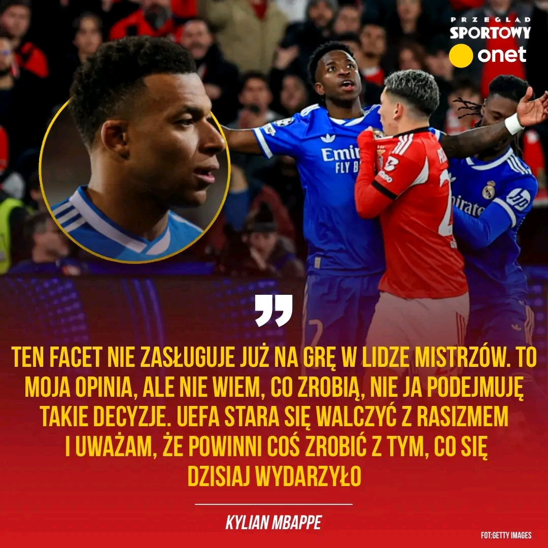 Mbappe uważa, że Prestianni powinien zostać wykluczony z uczestnictwa w rozgrywkach Champions League. Argentyńczyk zaprzecza oskarżeniom i twierdzi, że Brazylijczyk źle go zrozumiał. Do incydentu doszło tuż po tym, jak Vinicius dał Realowi prowadzenie na początku drugiej połowy meczu na Estadio da Luz w Lizbonie.