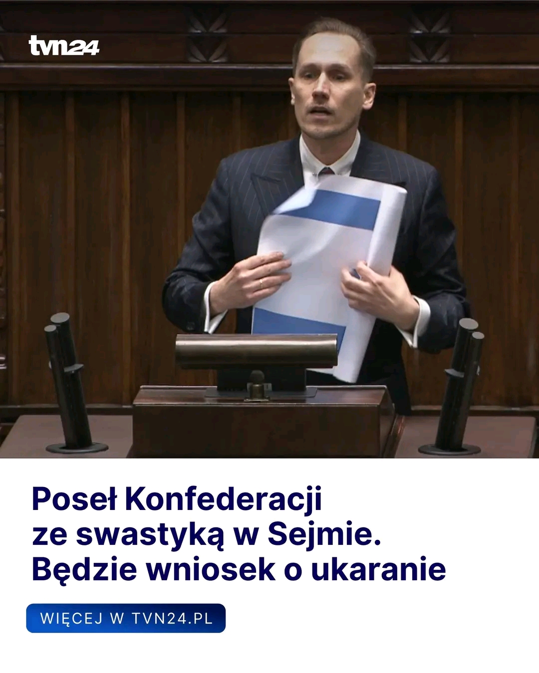Poseł Konfederacji Konrad Berkowicz we wtorek mówił z sejmowej mównicy o atakach Izraela na Bliskim Wschodzie. Stwierdził między innymi, że “Izrael dokonuje na naszych oczach ludobójstwa” i kraj ten jest “nową Trzecią Rzeszą”. Następnie zaprezentował wydruk flagi Izraela z zakazanym symbolem swastyki zamiast gwiazdy Dawida.