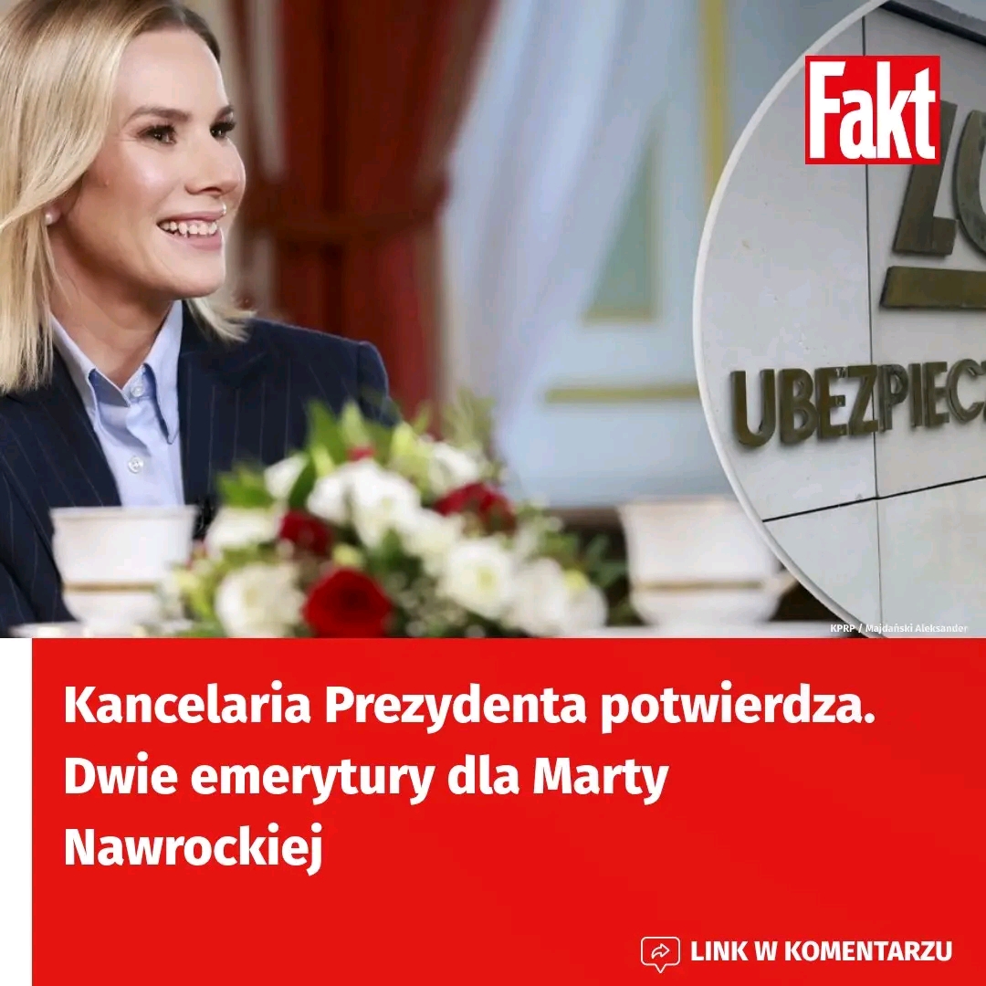 Kancelaria Prezydenta potwierdza doniesienia “Faktu”. Marta Nawrocka będzie dostawać dwie emerytury. Z jednej już korzysta — przeszła na nią w momencie objęcia przez jej małżonka urzędu prezydenta. Drugie świadczenie otrzyma po osiągnięciu wieku emerytalnego — i to nie jest błąd systemu. Skorzysta na przepisach wprowadzonych za czasów Andrzeja Dudy.