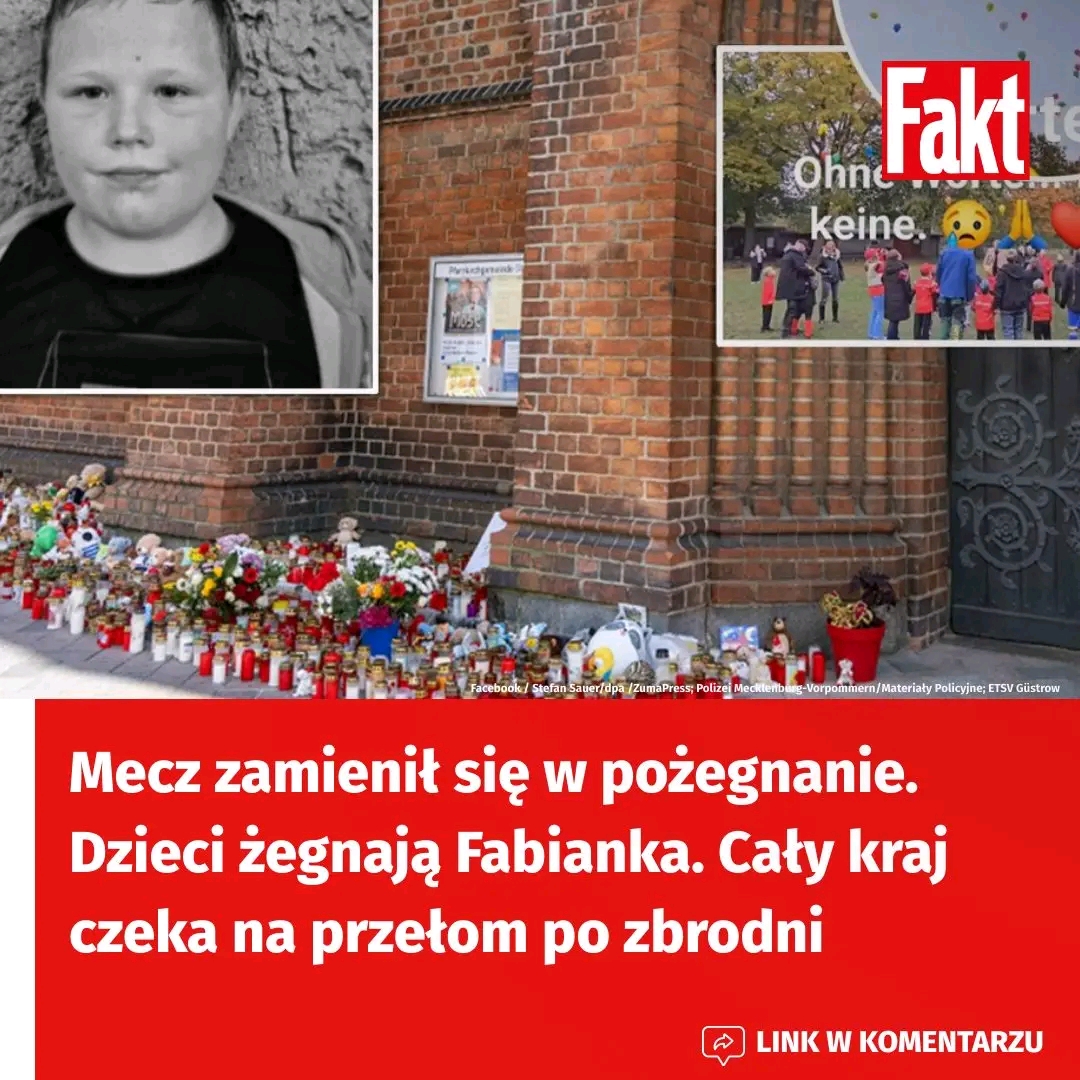 Güstrow żegna 8-letniego Fabiana. Niemcy wciąż są wstrząśnięte “brutalną zbrodnią” na dziecku i czekają na przełom w śledztwie. Chłopczyk w środę miał zagrać mecz w nowej koszulce piłkarskiej. Koledzy z drużyny w symboliczny sposób pożegnali Fabiana. Łzy same cisną się do oczu, gdy patrz się na ten hołd.