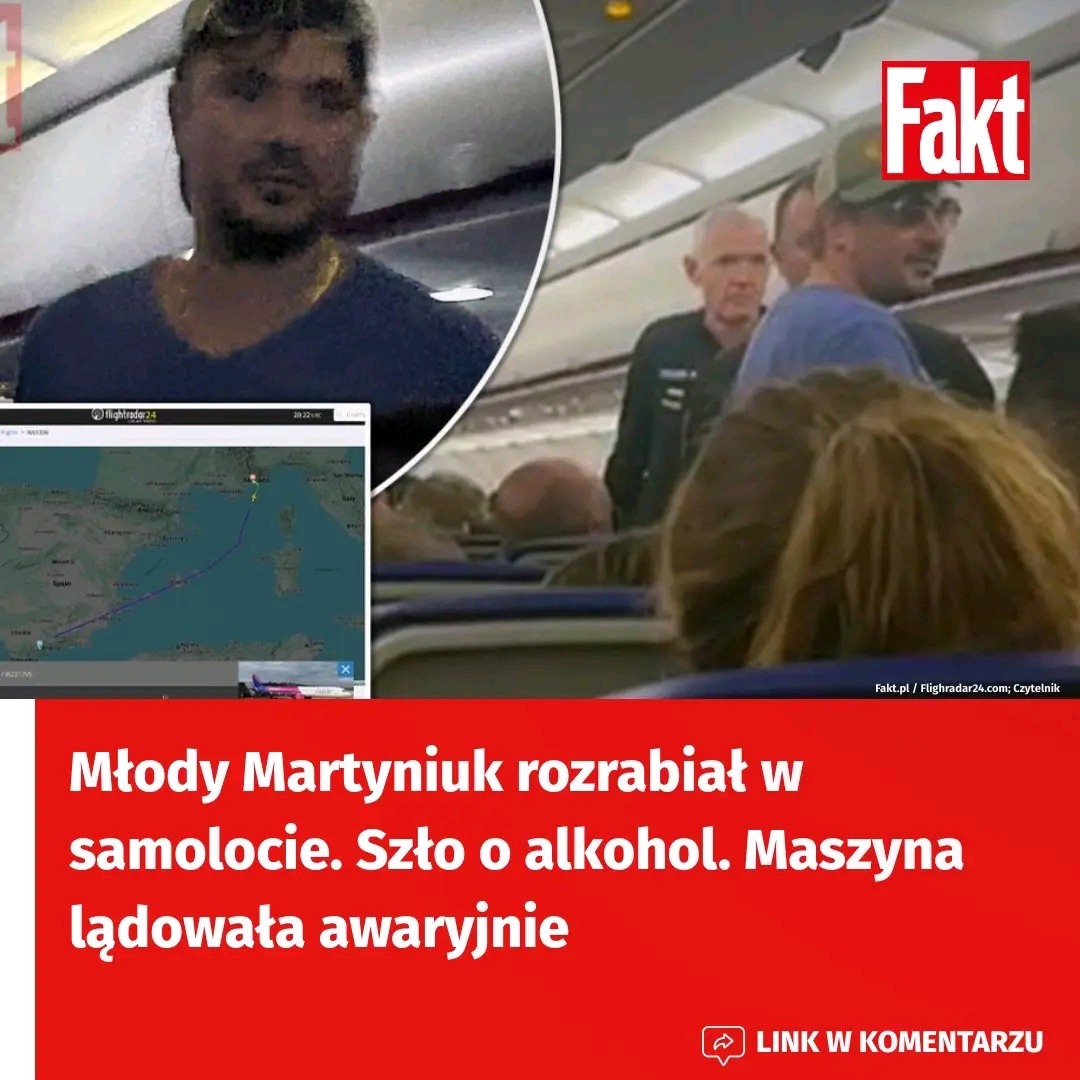 Jak dowiedział się “Fakt” Daniel Martyniuk, czyli syn gwiazdora polskiej sceny disco polo, był we wtorek 21 października w centrum awantury na pokładzie samolotu linii WizzAir. Celebryta kłócił się o alkohol. Sytuacja wymknęła się spod kontroli i zrobiło się na tyle groźnie, że załoga postanowiła dokonać nieplanowanego lądowania w Nicei. Wszystko po to, by pozbyć się namolnego pasażera z samolotu, a odpowiednie służby mogły się nim zająć.