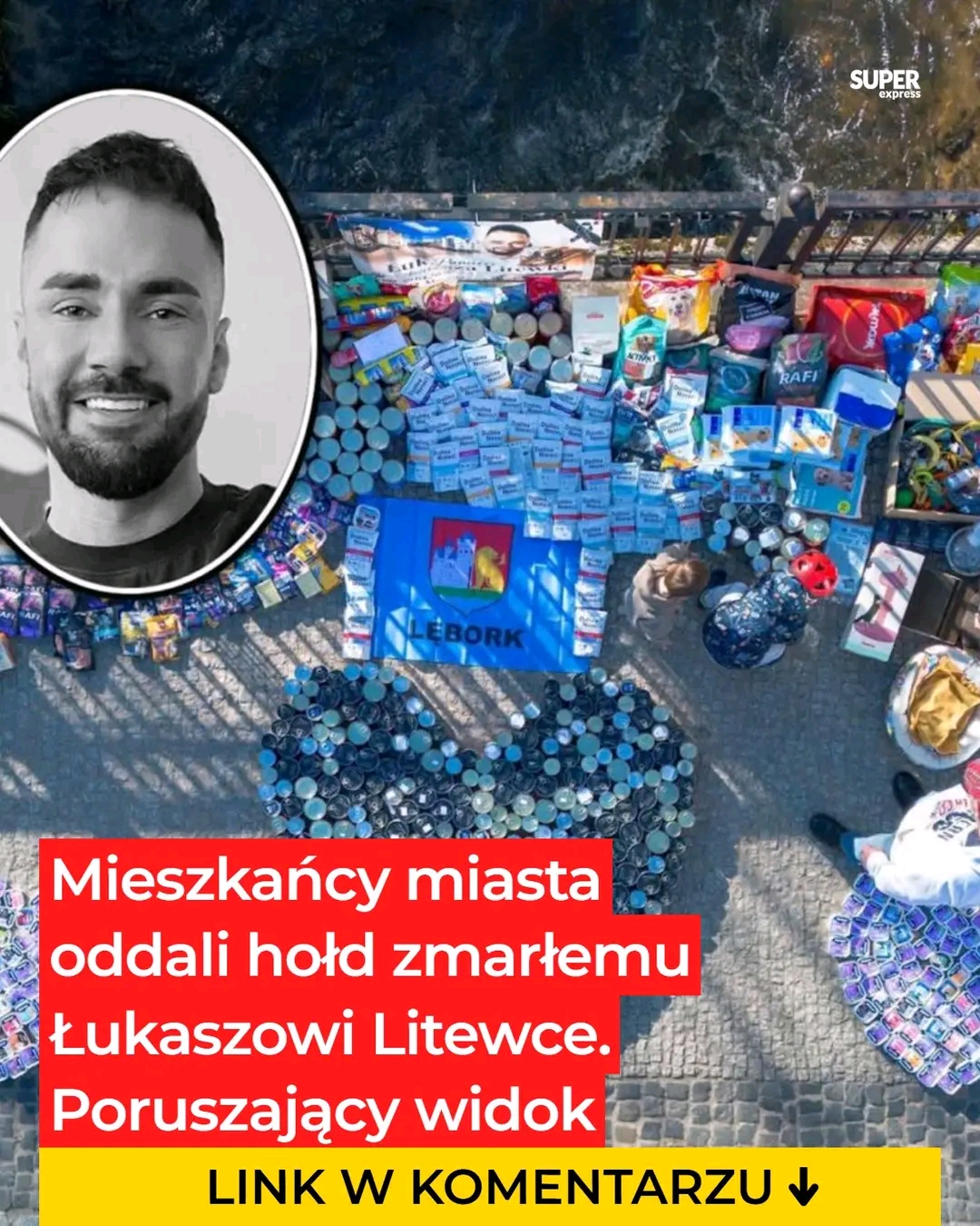 Most w centrum Lęborka zamienił się w miejsce wyjątkowej akcji. Zamiast kwiatów pojawiły się setki puszek i worków z karmą dla zwierząt. Mieszkańcy odpowiedzieli na apel po śmierci Łukasza Litewki w sposób, który idealnie oddaje jego działalność.