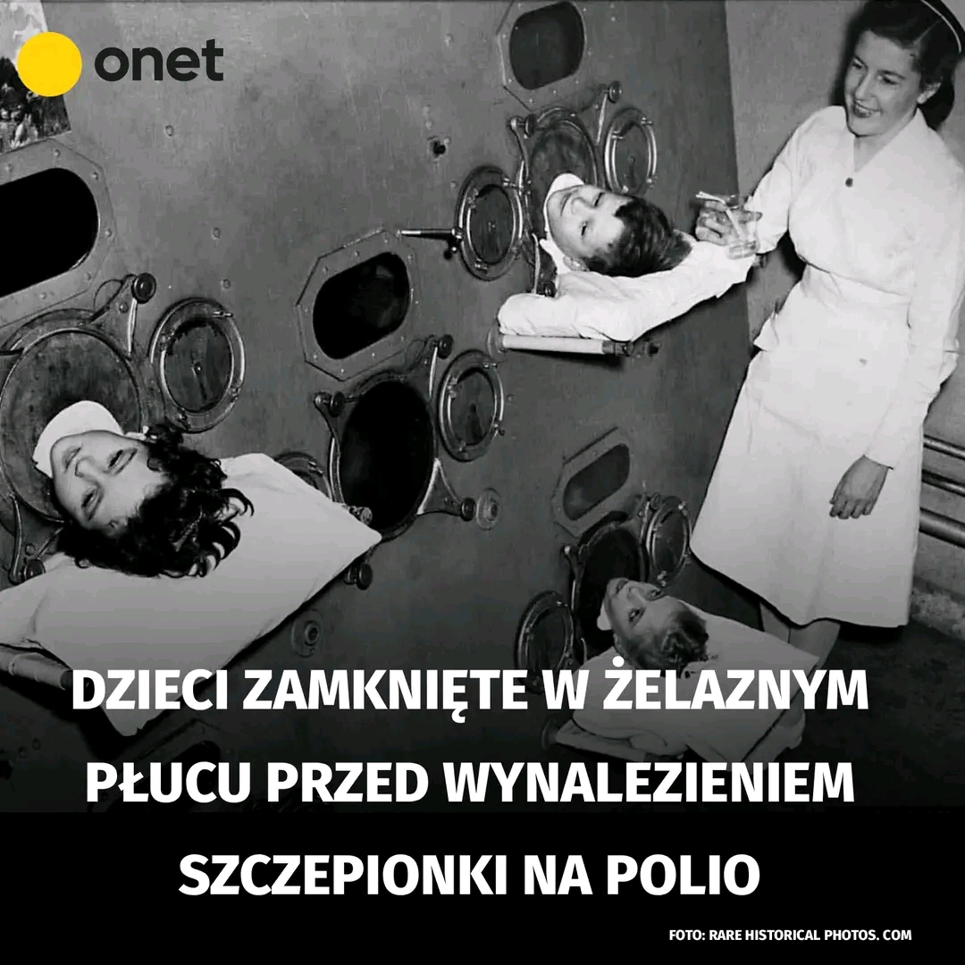 Na zdjęciu dzieci chore na polio w tzw. „żelaznych płucach” – urządzeniach ratujących życie, gdy wirus paraliżował mięśnie oddechowe.