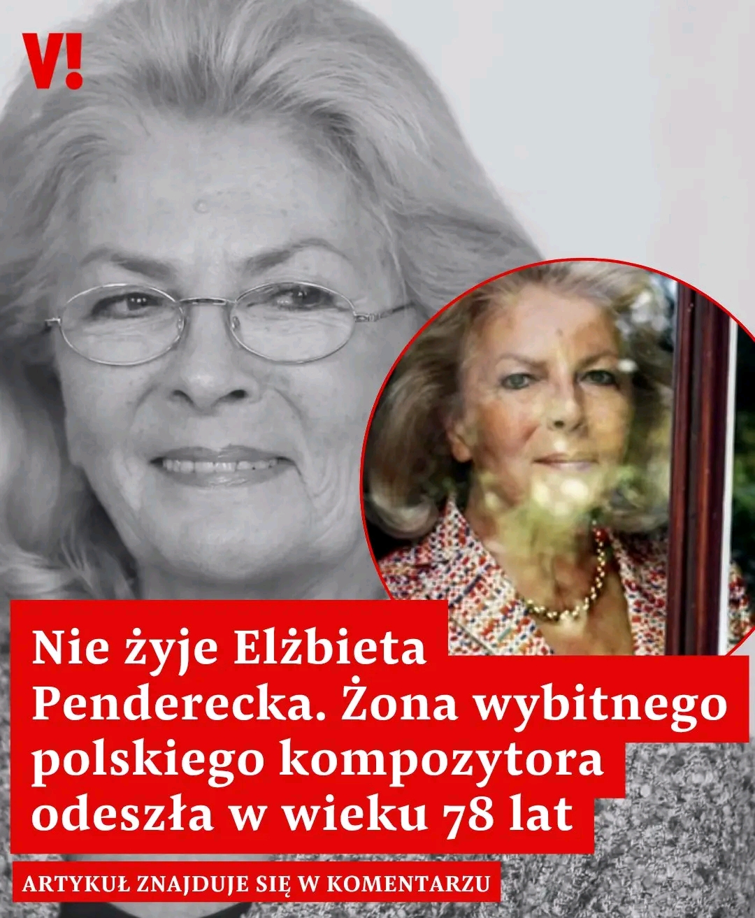 Niezwykle smutną wiadomość przekazał Andrzej Giza ze Stowarzyszenia im. Beethovena. „W dniu dzisiejszym odeszła nagle Elżbieta Penderecka, mecenas kultury, osoba, która w Polsce i na świecie promowała muzykę, wspierając kariery młodych artystów. Jej działalność twórcza i organizacyjna zyskała międzynarodowe uznanie. Była nie tylko inicjatorką wielu znaczących festiwali, ale i niezastąpionym wsparciem dla swojego męża, Krzysztofa Pendereckiego, towarzysząc mu zarówno w pracy twórczej, jak i podczas podróży po świecie”, czytamy.