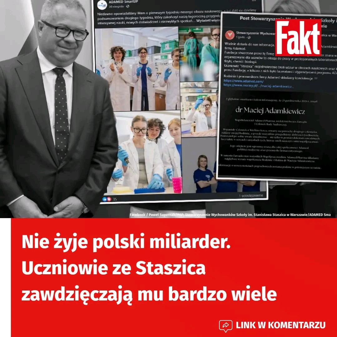 Nie tylko biznesmen i właściciel farmaceutycznego giganta. Maciej Adamkiewicz, który zmarł 23 października w wieku 59 lat, zostawił po sobie nie tylko miliardową firmę, ale też program, który zmienił życie tysięcy młodych ludzi w Polsce. Wśród nich — uczniowie prestiżowego warszawskiego liceum im. Stanisława Staszica. Dla nich Adamkiewicz nie był tylko nazwiskiem z listy najbogatszych. Był mecenasem nauki.