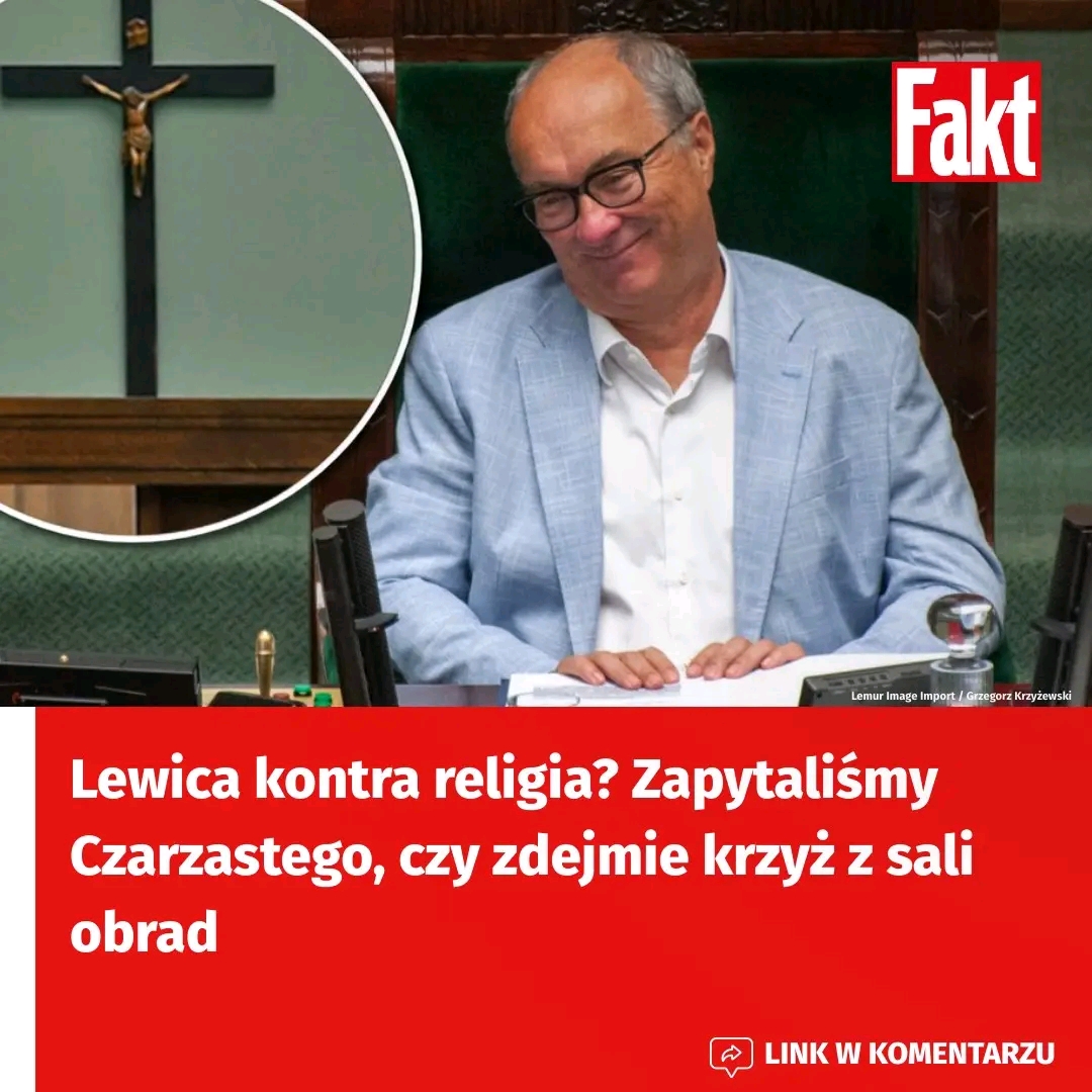 Jestem politykiem Lewicy. Lewica nigdy nie walczyła z wiarą i wiernymi. Lewica zawsze walczyła o państwo świeckie — odpowiedział Czarzasty. Marszałek podkreślił, że nie widzi potrzeby usuwania symbolu religijnego, wskazując na wcześniejsze propozycje prezydenta Warszawy Rafała Trzaskowskiego, które nie zyskały zainteresowania opinii publicznej. — Mówiąc wprost: nie będę z sali sejmowej zdejmował krzyża — zapewnił.