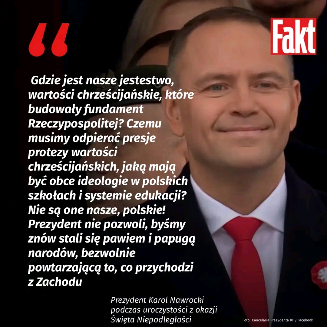 Trwają obchody Święta Niepodległości na Placu Piłsudskiego w Warszawie. — Polska złotówka była, jest i będzie symbolem polskiej suwerenności. (…) Gdzie jest nasze jestestwo, wartości chrześcijańskie, które budowały fundament Rzeczypospolitej? Czemu musimy odpierać presje protezy wartości chrześcijańskich, jaką mają być obce ideologie w polskich szkołach i systemie edukacji? Nie są one nasze, polskie! Prezydent nie pozwoli, byśmy znów stali się pawiem i papugą narodów, bezwolnie powtarzającą to, co przychodzi z Zachodu — mówił podczas przemówienia prezydent Karol Nawrocki.