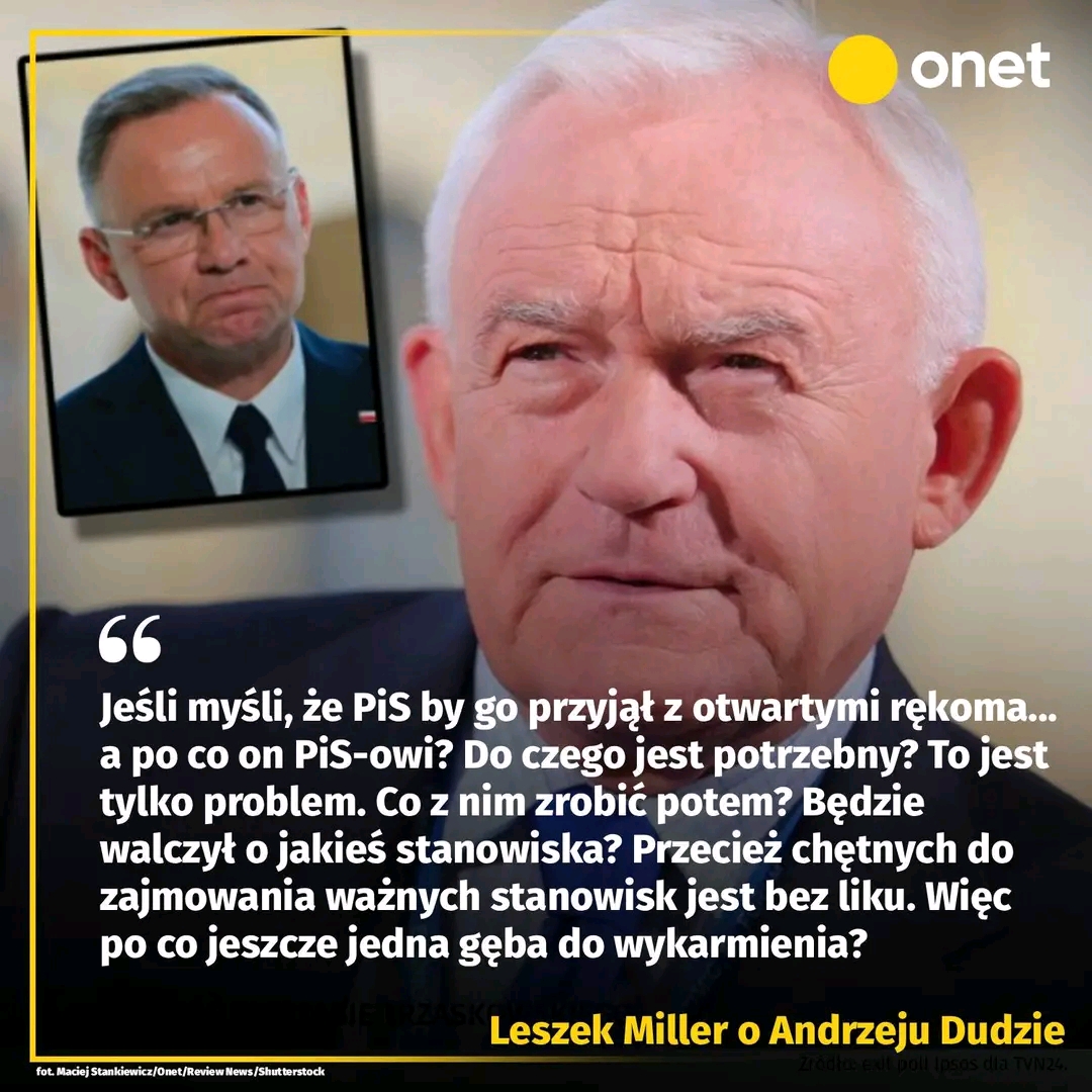 — Jeśli myśli, że PiS by go przyjął z otwartymi rękoma… a po co on PiS-owi? Do czego jest potrzebny? To jest tylko problem. Co z nim zrobić potem? Będzie walczył o jakieś stanowiska? Przecież chętnych do zajmowania ważnych stanowisk jest bez liku. Więc po co jeszcze jedna gęba do wykarmienia? — mówił Miller na antenie Radia RDC.