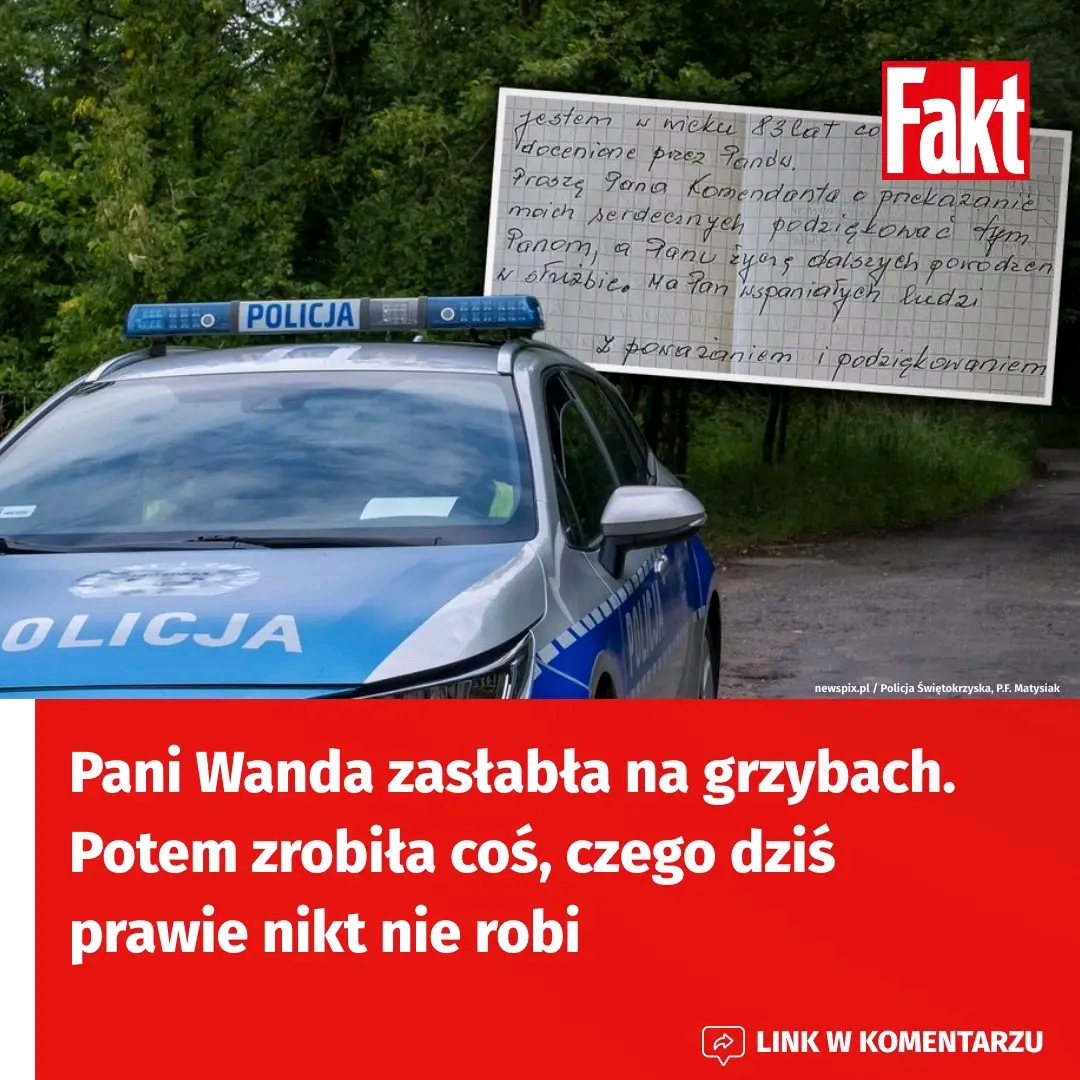 Zasłabła w lesie pod Grybowem w województwie świętokrzyskim i nie mogła się ruszyć. Policjanci dotarli do niej w ostatniej chwili i uratowali przed wychłodzeniem. Kilka dni później zrobili wielkie oczy, gdy zobaczyli, co 83-letnia pani Wanda im przysłała. Ten gest poruszył wszystkich, którzy poznali jej historię.