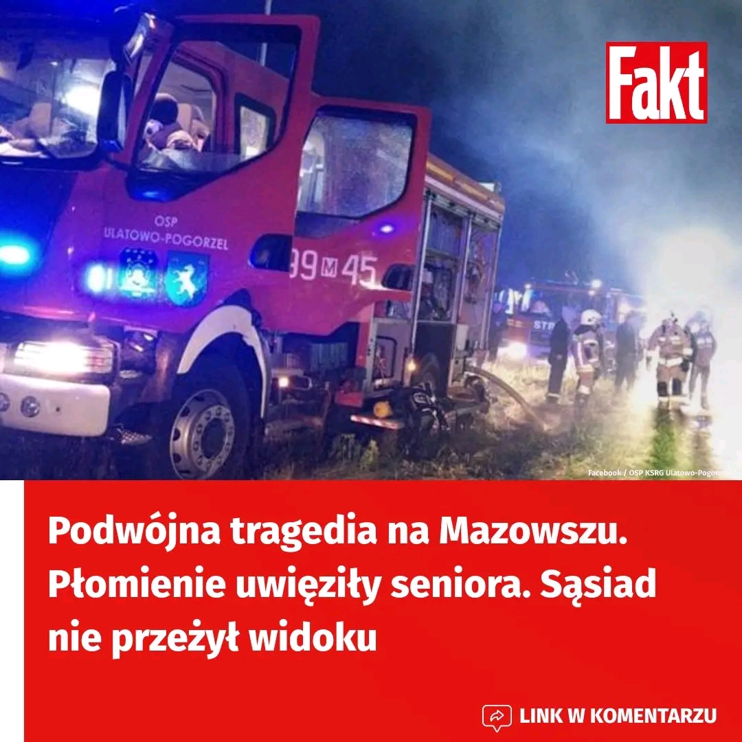 Dramat w mazowieckiej miejscowości Ulatowo-Pogorzel. W nocy spłonął drewniany dom. W środku zginął 92-letni mężczyzna. Na miejsce przybiegł 64-letni sąsiad. Gdy zobaczył płomienie pochłaniające budynek, zasłabł. Strażacy walczyli o jego życie, ale jak podał lokalny serwis, mężczyzny nie udało się uratować. To była podwójna tragedia.