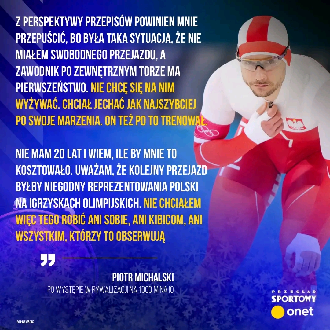 Błąd rywala wykluczył Piotra Michalskiego z rywalizacji na 1000 m, ale Polak nie zdecydował się na powtórzenie biegu. — Uważam, że kolejny przejazd byłby niegodny reprezentowania Polski na igrzyskach olimpijskich, więc nie chciałem tego robić ani sobie, ani kibicom, ani wszystkim, którzy to obserwują — mówił wprost. Dla naszego reprezentanta to jeszcze nie koniec igrzysk.