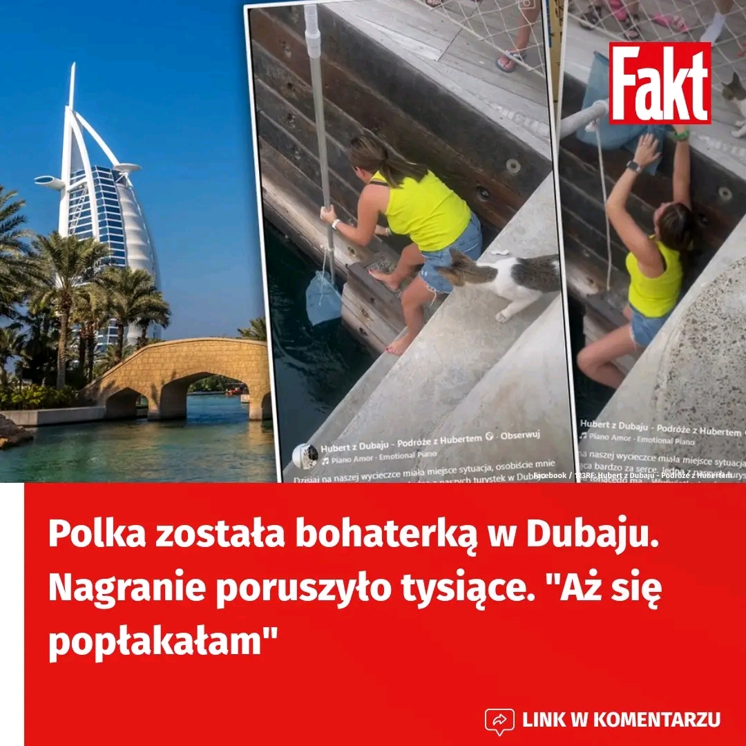 Na nagraniu opublikowanym na koncie “Hubert z Dubaju – Podróże z Hubertem” widać, jak Polka zeszła z betonowego nabrzeża i stojąc na wąskim stopniu tuż nad wodą stara się wyłowić tonącego kotka. Wszystkiemu temu przygląda się przestraszona kocia mama. W końcu udaje złapać się malucha w siatkę i bezpiecznie wyciągnąć go, całego przemoczonego, na brzeg.